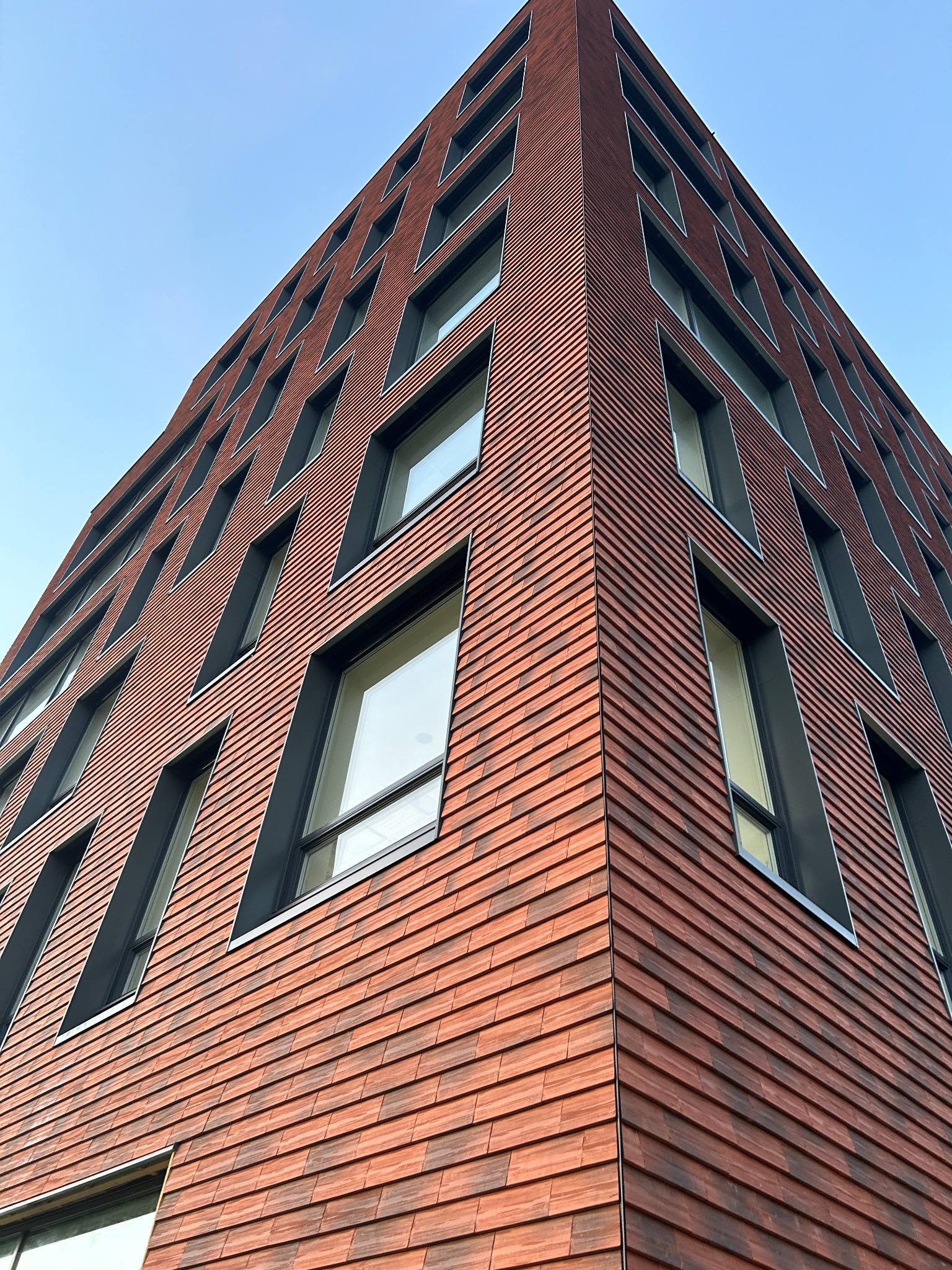 Byggets fasader kles i rødlig skjermtegl som gir en fin kontrast mot både det sorte og lyse nabobygget.